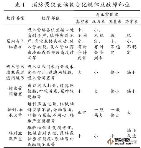 與正常值相比,消防泵儀表讀數變化規律及故障部位如表 1 所示。