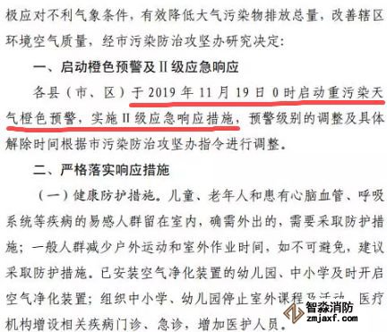 為保護公眾健康,降低大氣污染強度,指揮部辦公室決定于11月20日13:30時發布重污染天氣橙色預警信息,從2019年11月20日16時起啟動Ⅱ級應急響應。