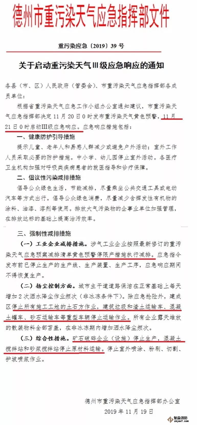 11月19日,市重污染天氣應急指揮部發布通知,根據省重污染天氣應急工作小組辦公室通知建議,市重污染天氣應急指揮部決定11月20日0時發布重污染天氣黃色預警,11月21日0時啟動重污染天氣Ⅲ級應急響應。