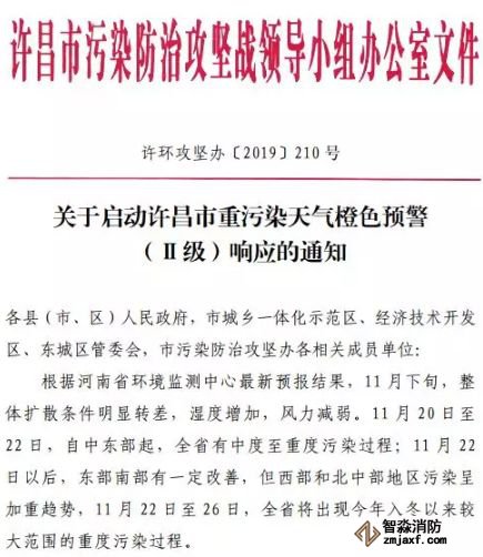 11月18日三門峽市也發布了《關于重污染天氣橙色預警并啟動二級應急響應的通知》稱,根據省環境監測中心最新預報結果和《三門峽市空氣質量預報分析》(第【2019】322期)預報分析,未來幾天受氣壓場影響,三門峽市大氣擴散條件由一般轉變差,同期受污染傳輸影響,全市將出現中度至中度污染過程。為最大程度減輕污染峰值、降低重度污染持續時間,保護人民群眾身體健康,按照《河南省重污染天氣應急預案》(豫政辦【2019】56號)及省污染防治攻堅辦《關于啟動重污染天氣橙色預警的通知》要求,經市環境污染防治攻堅戰領導小組辦公室、三門峽市跟蹤研究團隊會商研判,決定發布重污染天氣橙色預警,自11月19日0時啟動二級響應及應急減排措施,解除時間另行通知。