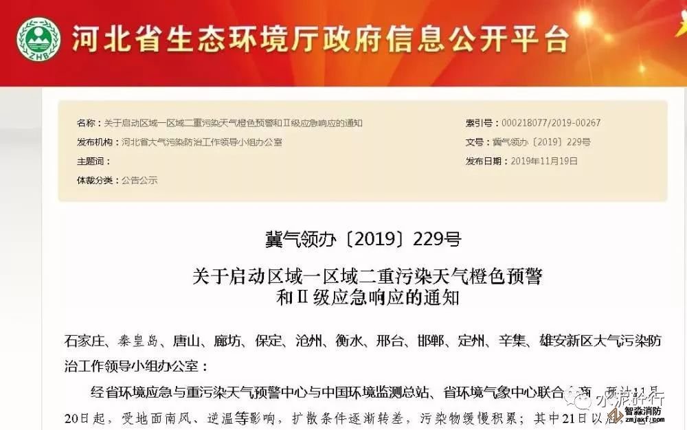 19日,河北省大氣污染防治工作領導小組辦公室發布《關于啟動區域一區域二重污染天氣橙色預警和Ⅱ級應急響應的通知》。