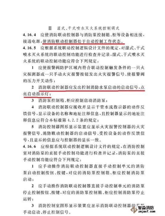其中4.16.4條提出“使消防聯動控制器處于自動控制工作狀態”,4.16.5相關規定“消防聯動控制器應發出控制消防水泵啟動的啟動信號”,這些規定明顯與現行的《火災自動報警系統設計規范》及《自動噴水滅火系統設計規范》的相關規定存在抵觸。