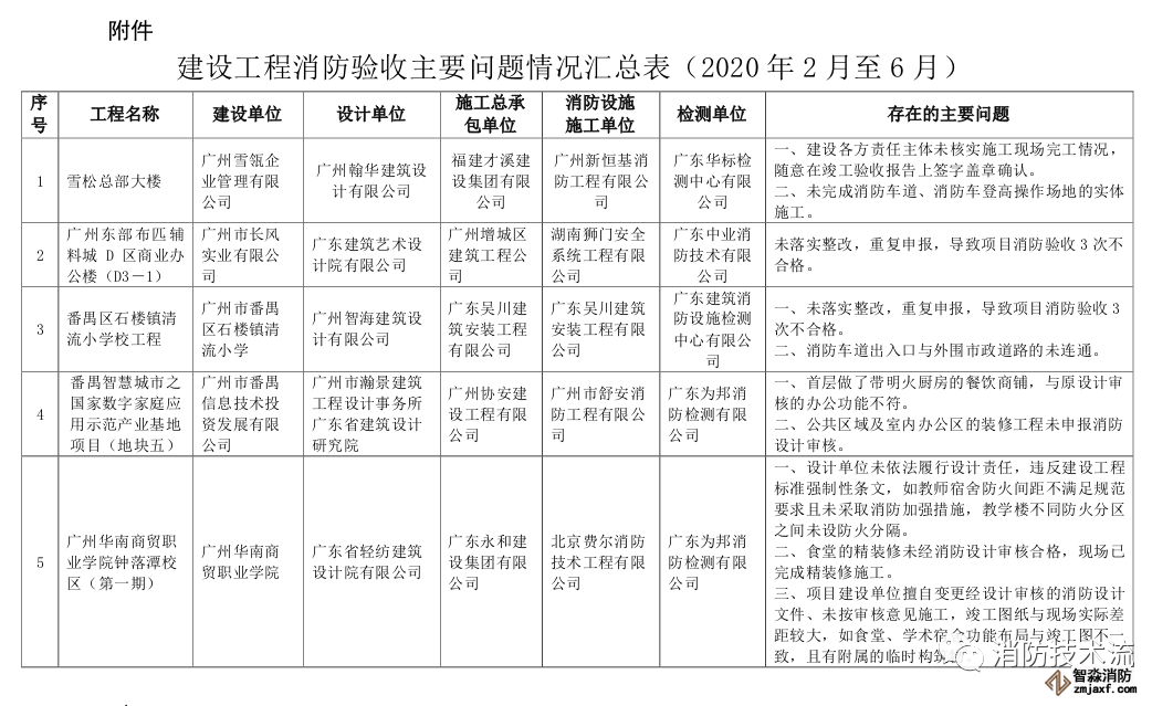 附件:建設工程消防驗收主要問題情況匯總表(2020年2月至6月)