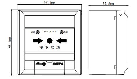 本消火栓按鈕為紅色全塑結構,分底盒與上蓋兩部分。底盒與上蓋采用拔插式結構裝配,安裝拆卸簡單、方便,連接緊密,非常便于工程調試及維修更換。消火栓按鈕外形示意圖如圖 2- 9: