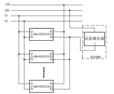 這種方式中,消火栓按鈕按下,可直接控制消防泵的啟動,泵運行后,火災報警控制器確認泵已啟動后,將點亮消火栓按鈕上的綠色回答指示燈。