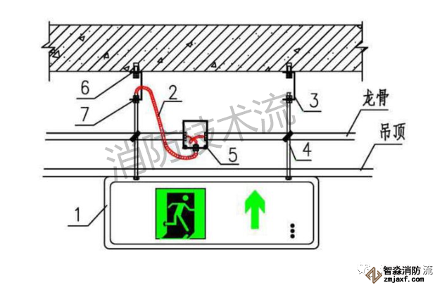 標(biāo)志燈采用吸頂和吊裝式安裝;室內(nèi)高度大于3.5m的場(chǎng)所,特大型、大型、中型標(biāo)志燈宜采用吊裝式安裝。燈具采用吊裝式安裝時(shí),應(yīng)采用金屬吊桿或吊鏈,吊桿或吊鏈上端應(yīng)固定在建筑構(gòu)件上。