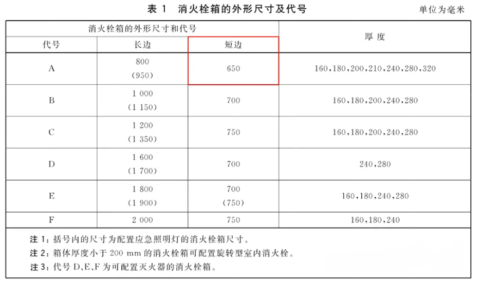但是,國標中消火栓箱短邊最小為650mm,短邊小于650mm的消火栓箱屬于窄型消火栓箱,即非標箱,非標箱的應用目前存在爭論。